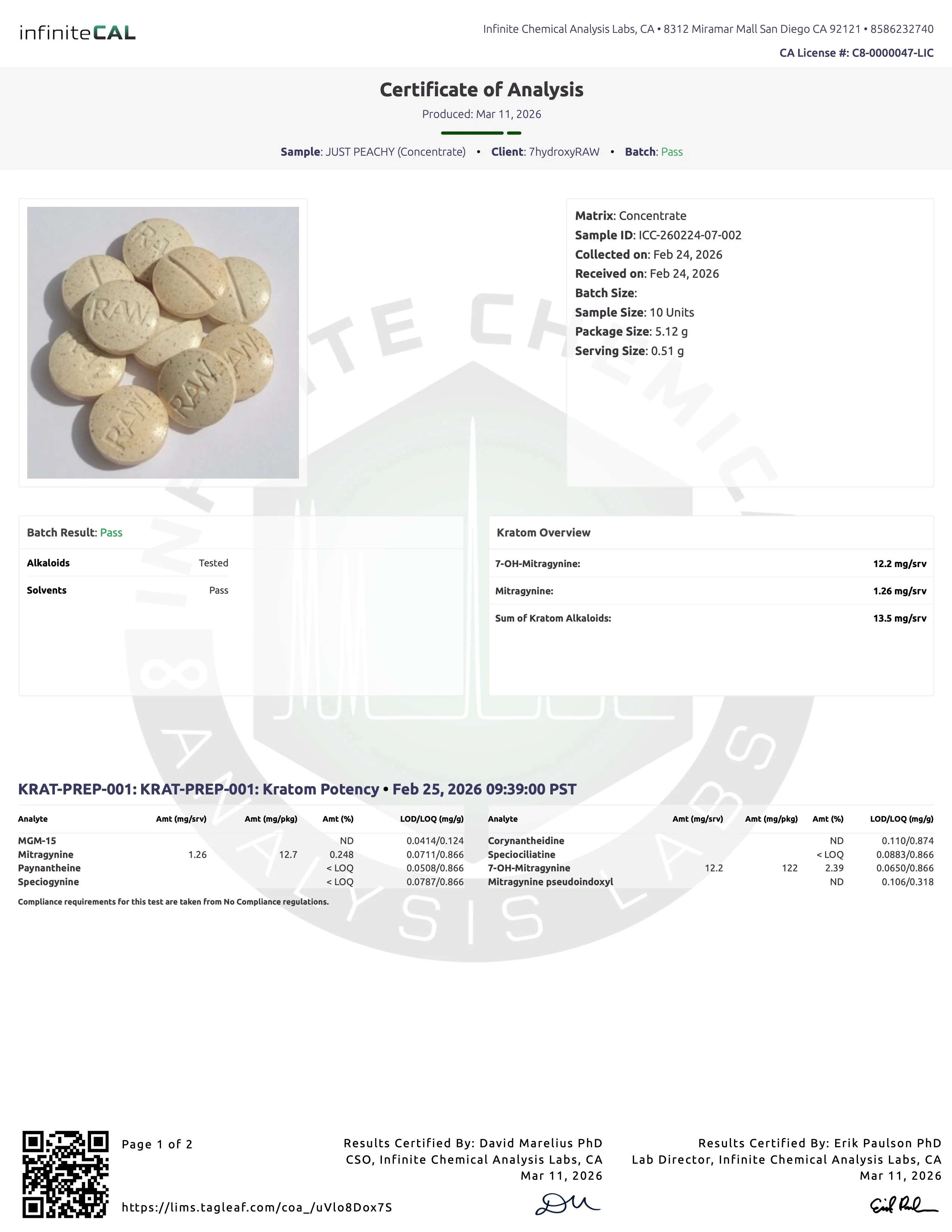 LABS FOR POTENCY 1 (13.5MG ALKS) AND 2 (14.77MG ALKS) AND SOLVENTS - RELEASED 03.17.26