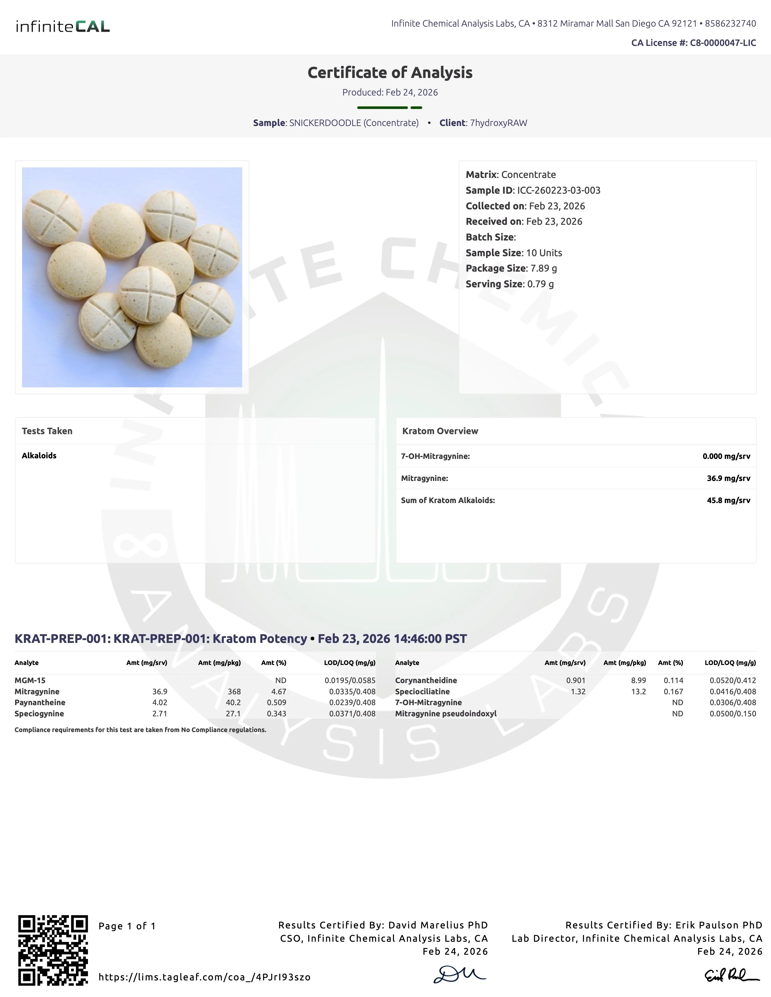 LABS FOR POTENCY 1 (45.8MG ALKS) AND 2 (57.3MG ALKS) AND SOLVENTS - RELEASED 02.23.26